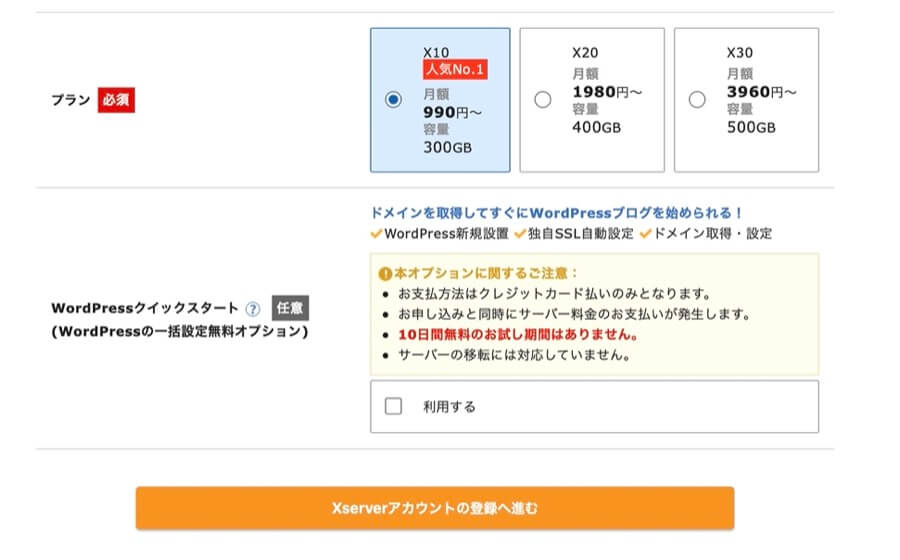 ※「WordPressクイックスタート」をチェックしてしまうと10日間の無料お試し期間がなくなってしまいます。